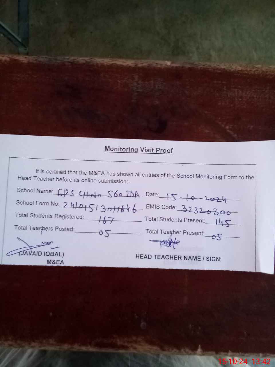 | Attendance Register | Head Teacher | MEA with School | Visit Proof |