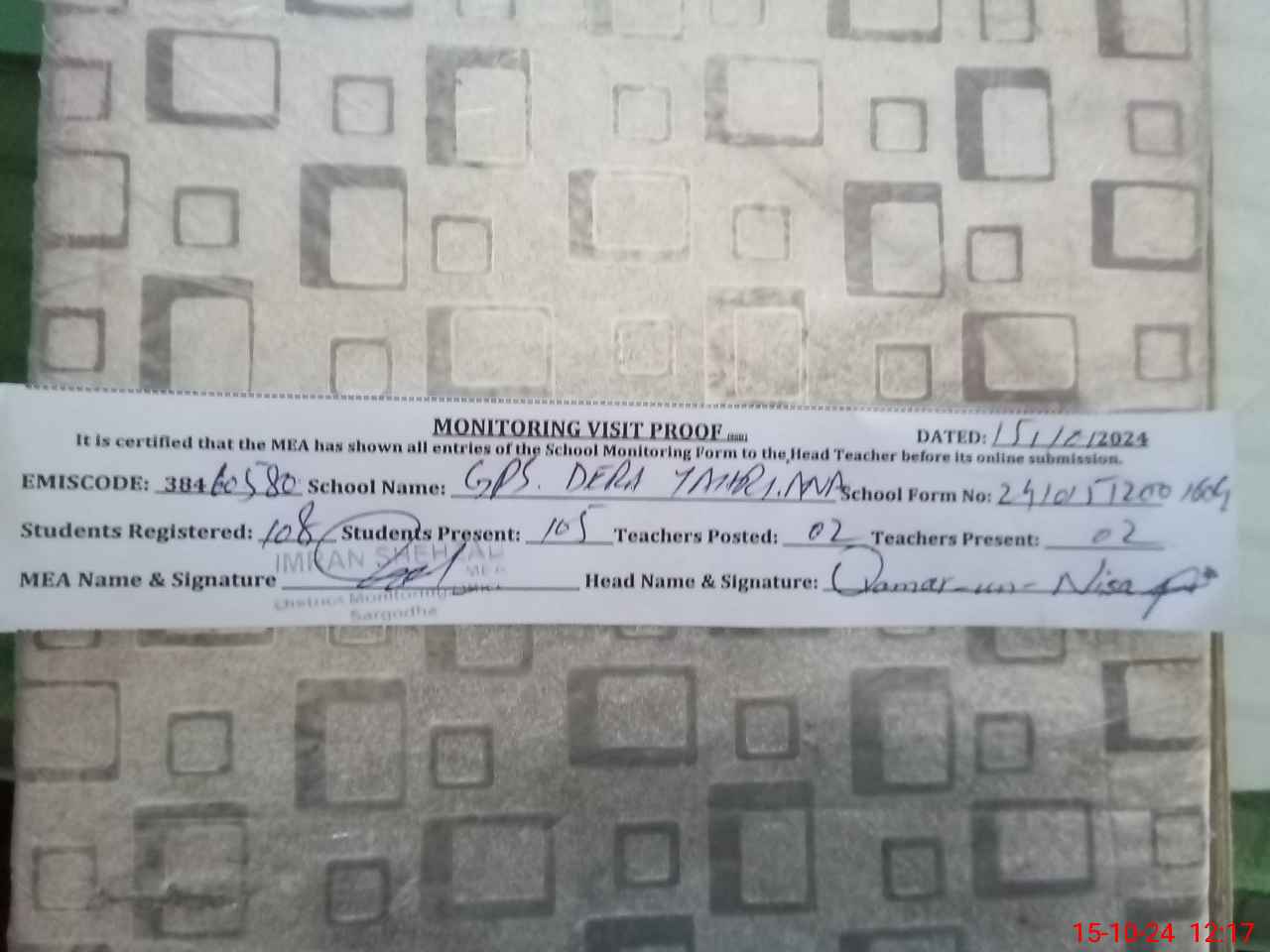 | Certified that this School was Inspected by the Undersigned MEA/DMO Today and the Information Stated Above is as Per Record. | |||||