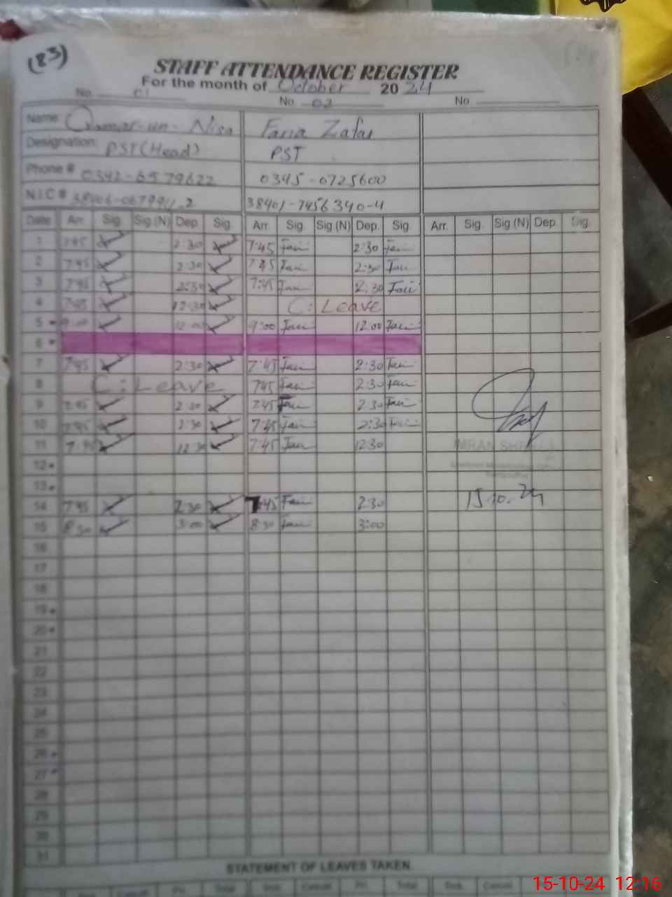 | CNIC | Full Name | Designation | R/C | Absence during last cal. month |