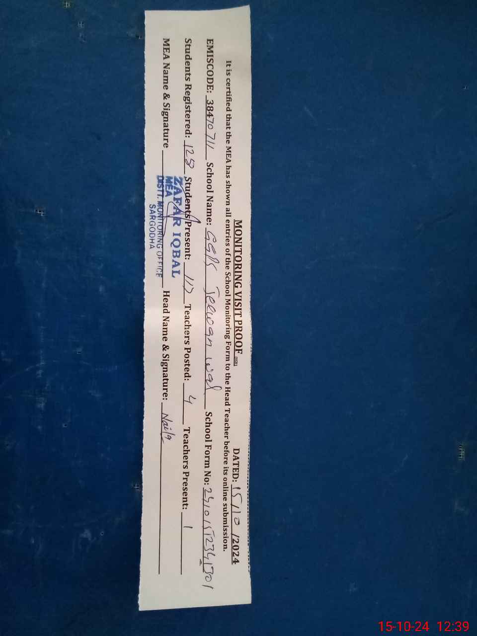| Certified that this School was Inspected by the Undersigned MEA/DMO Today and the Information Stated Above is as Per Record. | |||||