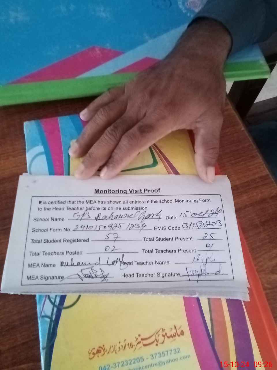 | Attendance Register | Head Teacher | MEA with School | Visit Proof |
