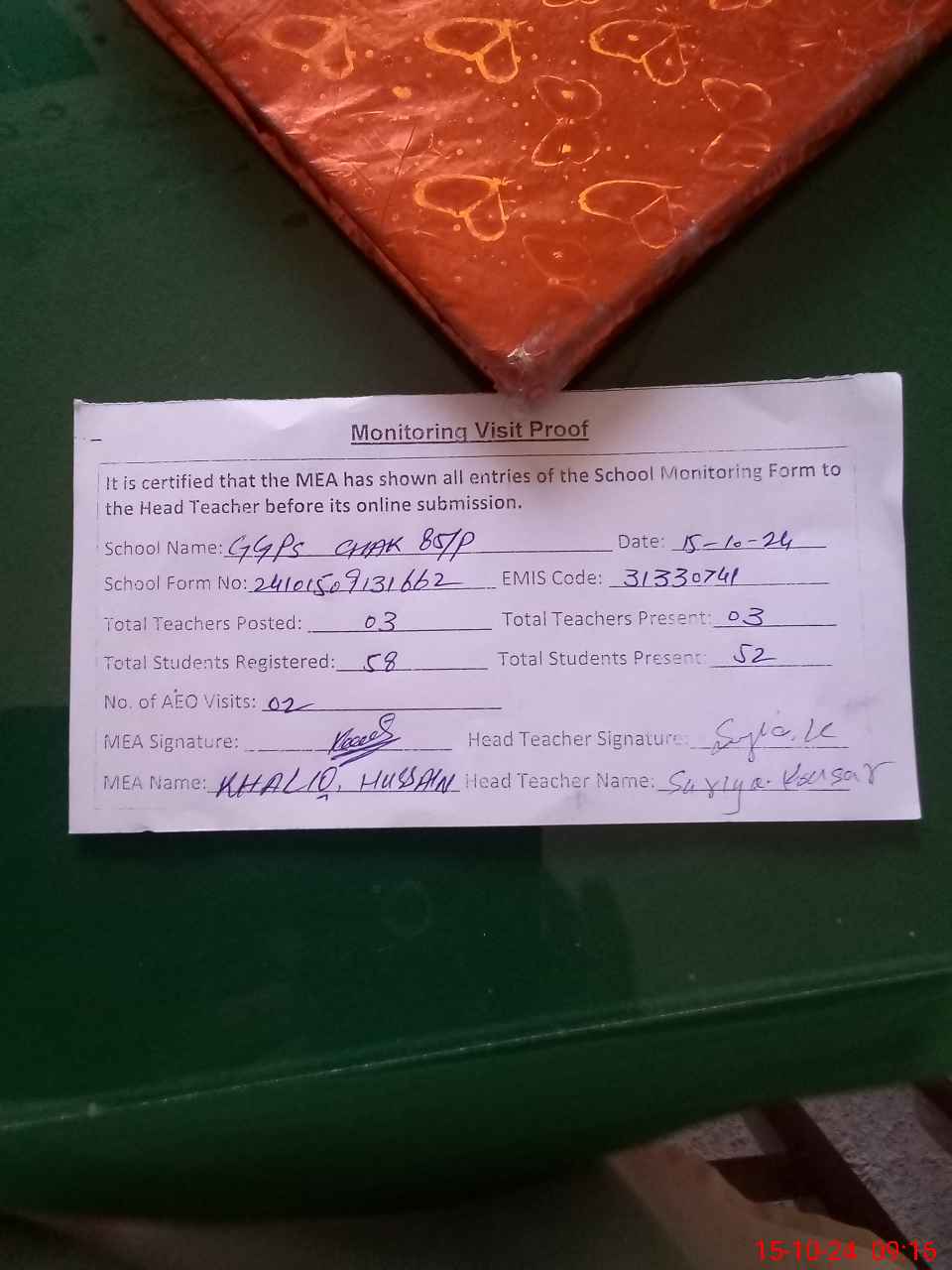 | Attendance Register | Head Teacher | MEA with School | Visit Proof |