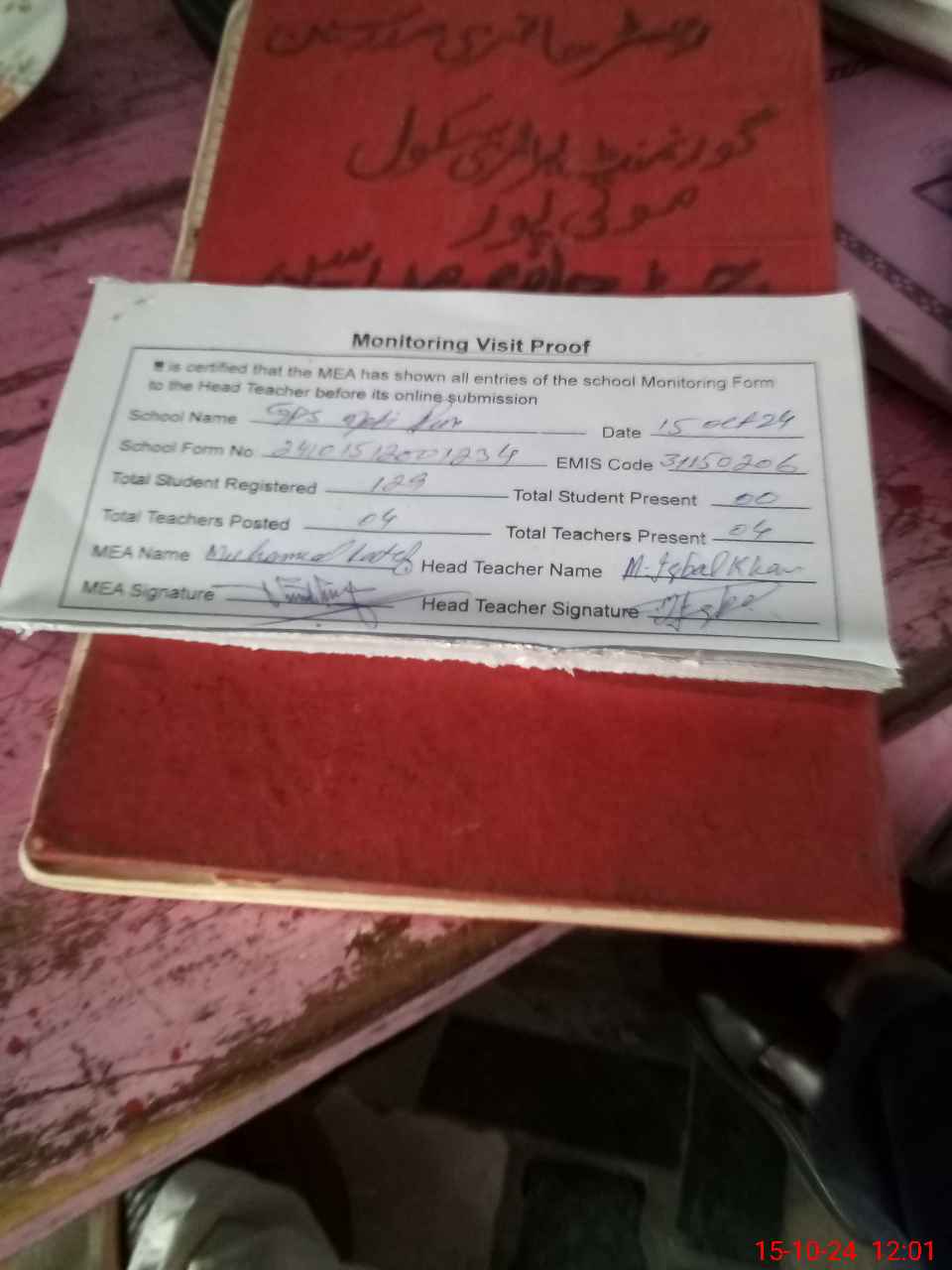 | Attendance Register | Head Teacher | MEA with School | Visit Proof |