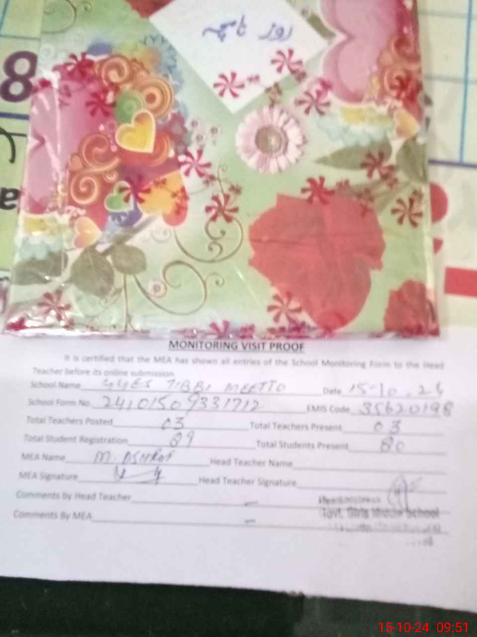 | Attendance Register | Head Teacher | MEA with School | Visit Proof |