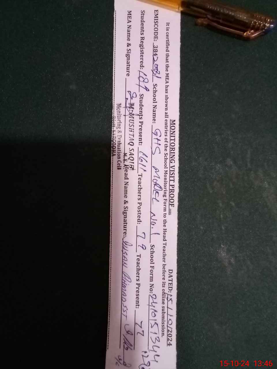 | Certified that this School was Inspected by the Undersigned MEA/DMO Today and the Information Stated Above is as Per Record. | |||||