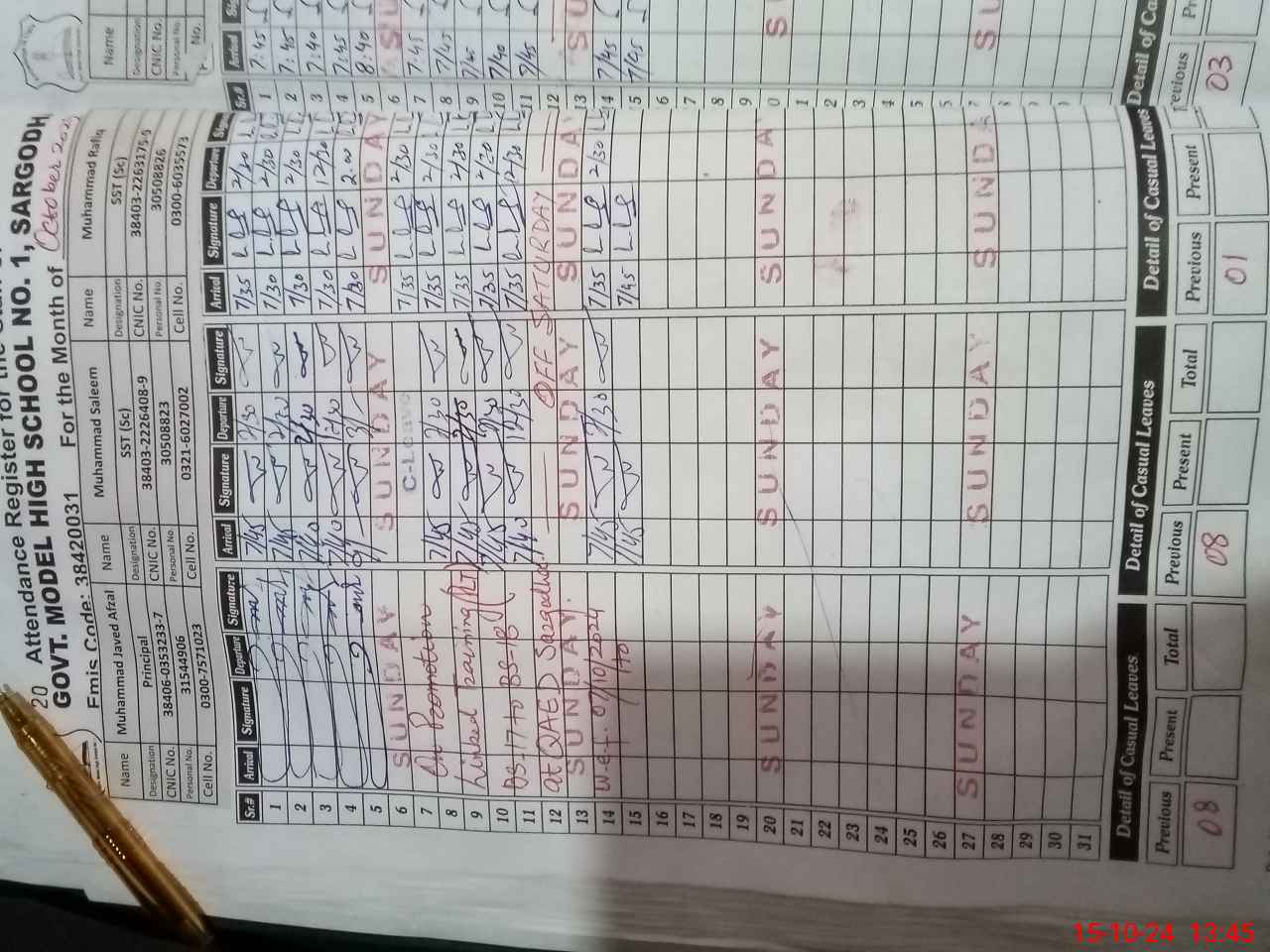 | CNIC | Full Name | Designation | R/C | Absence during last cal. month |