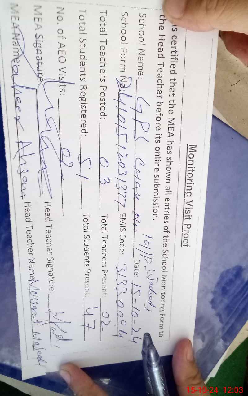 | EMIS Code: 31330094 | Name of School: GPS CHAK 101/P JADEED | |||