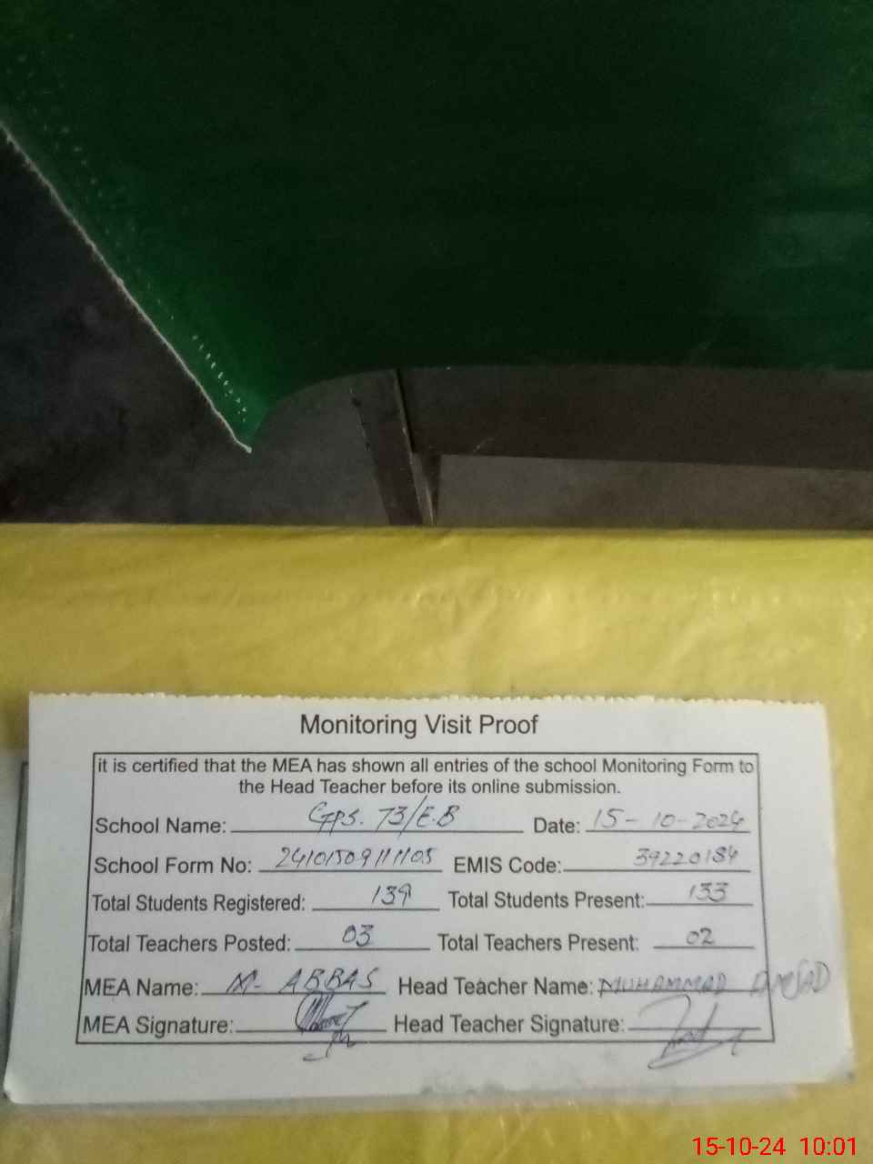 | EMIS Code: 39220184 | Name of School: GPS 73 EB P/O CHAK NO 75/EB | |||