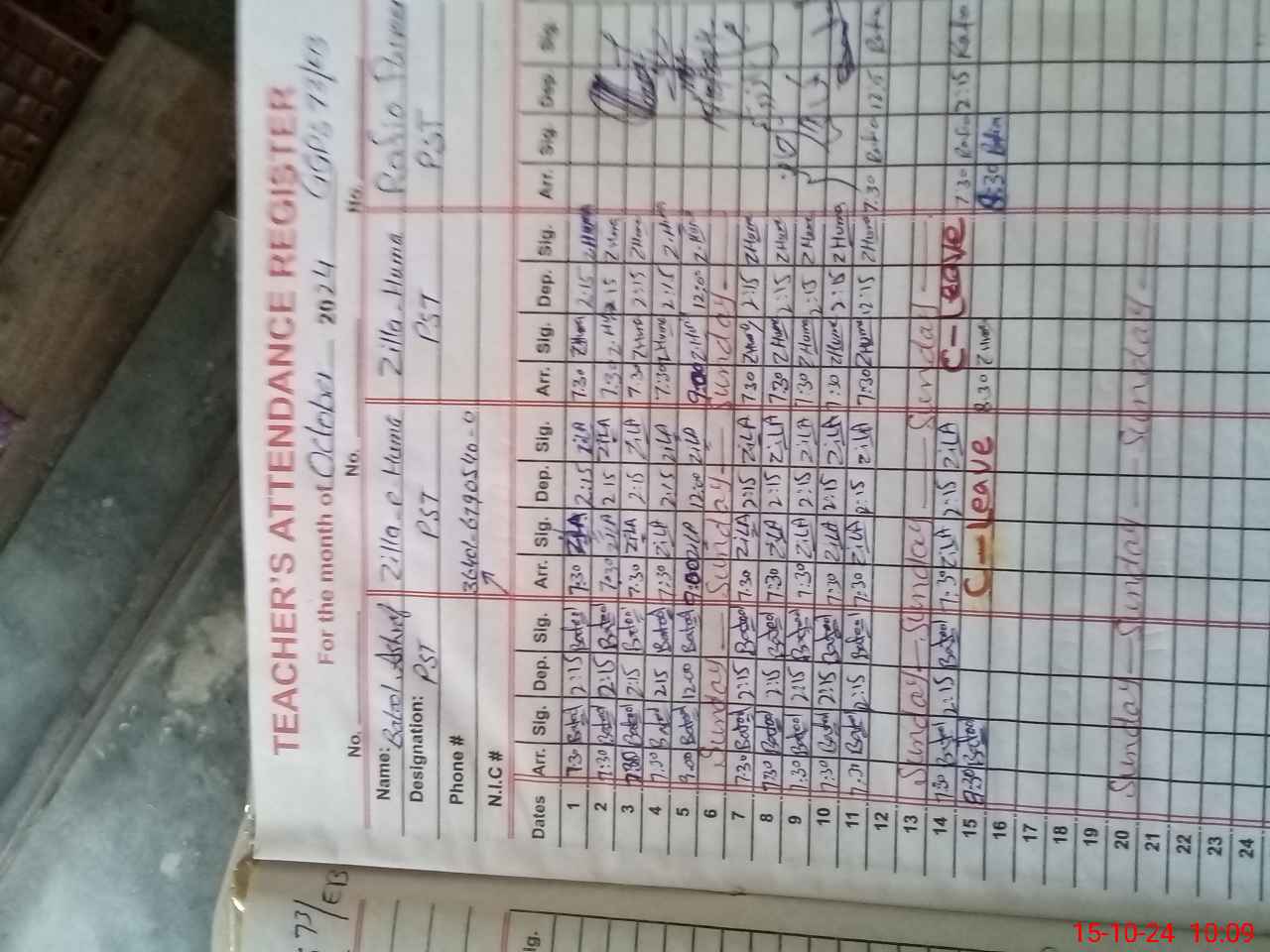 | CNIC | Full Name | Designation | R/C | Absence During Last Calender Month |