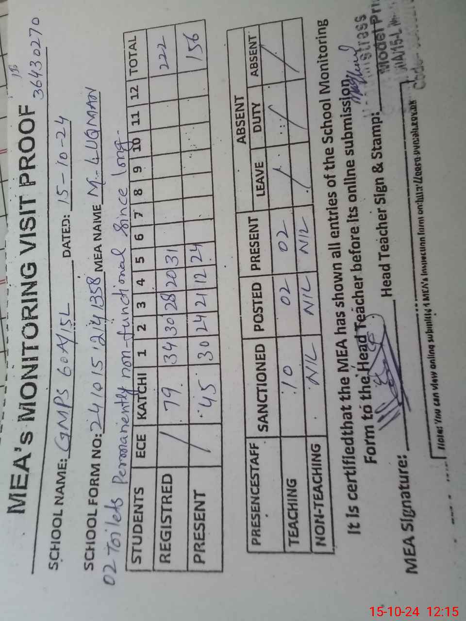 | Attendance Register | Head Teacher | MEA with School | Visit Proof |