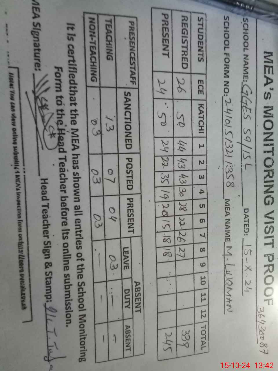 | Certified that this School was Inspected by the Undersigned MEA/DMO Today and the Information Stated Above is as Per Record. | |||||