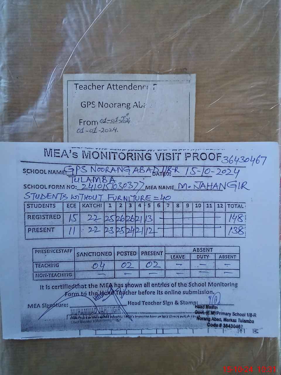 | Attendance Register | Head Teacher | MEA with School | Visit Proof |