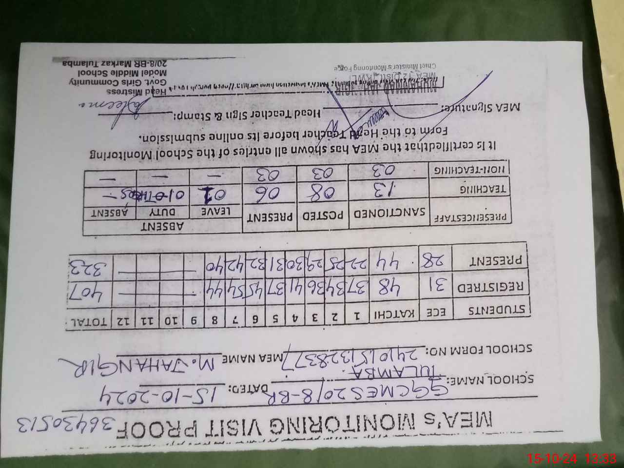 | Attendance Register | Head Teacher | MEA with School | Visit Proof |