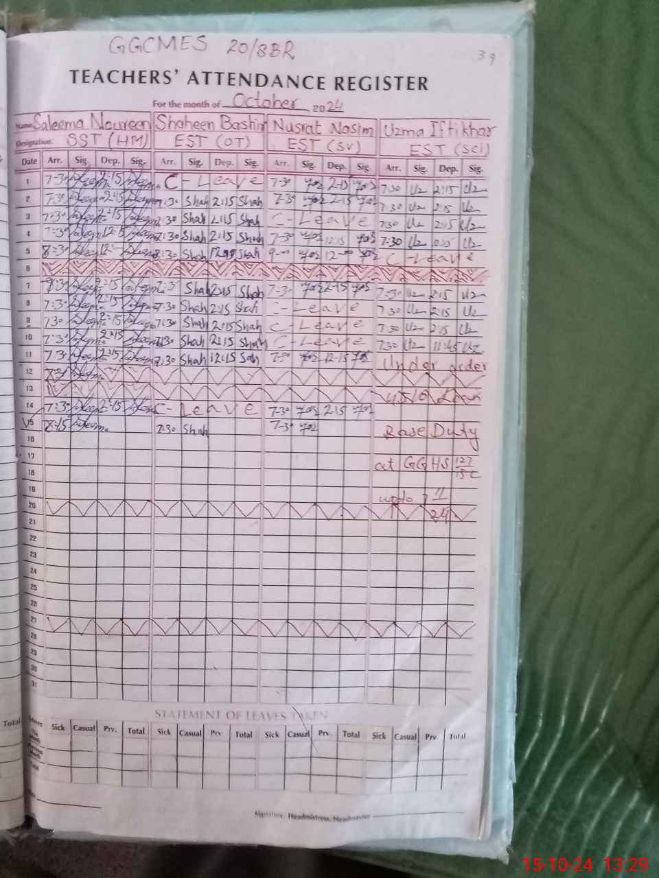 | Remarks (Use Separate Page if Required): LESSON PLANS ARE NOT AVAILABLE UZMA IFTIKHAR EST SC IS ON TEMPORARY DUTY NEED BASE FROM 11 OCTOBER 2024 TO 07 NOVEMBER 2024 OR TILL THE COMPLETION OF ASSIGNMENTS DUTY ORDERS ARE SIGNED BY ASSTT DIRECTOR ADMIN KHANEWAL ON BEHALF OF CEO DEA KHANEWAL RANDOM CLASS ONE IS NOW IN CLASS FOUR | |||||