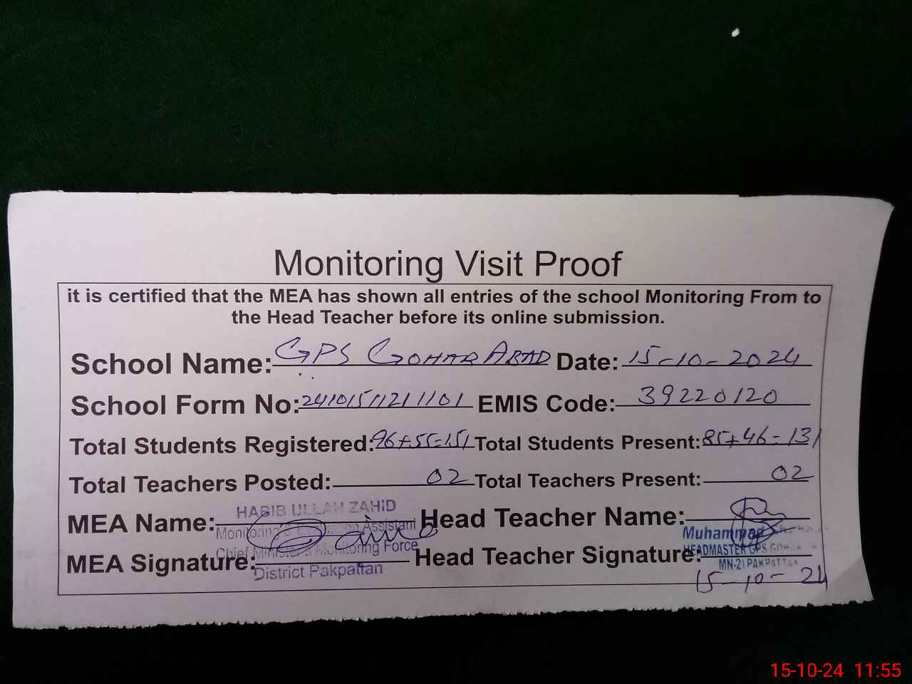 | Certified that this School was Inspected by the Undersigned MEA/DMO Today and the Information Stated Above is as Per Record. | |||||