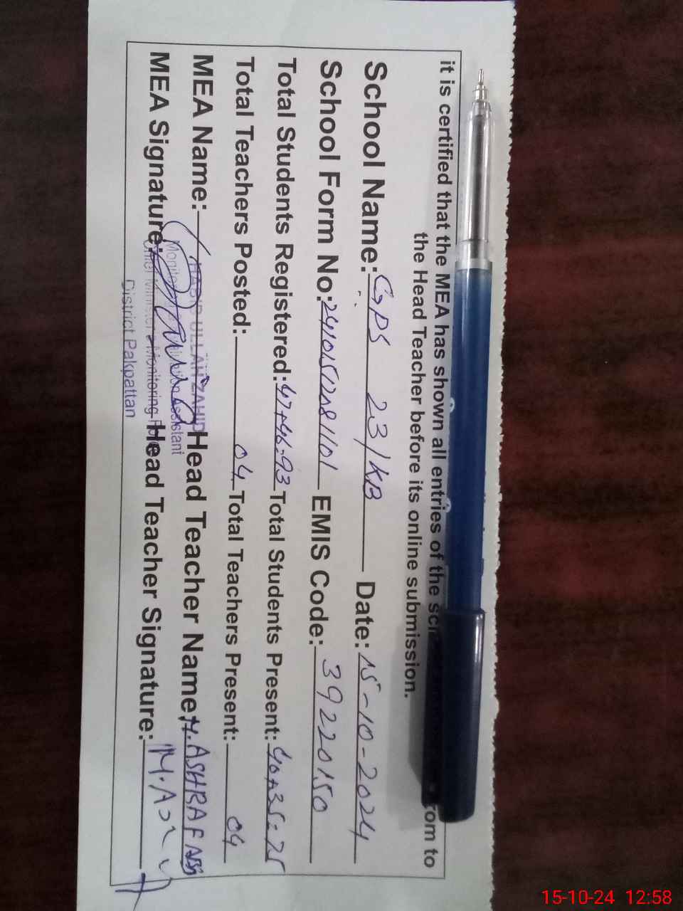| Name: AN**** JA**** Designation: (School Headmaster's/Headmistress's) PST Phone/Cell Number: 03**** |