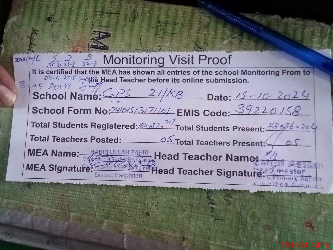 | EMIS Code: 39220158 | Name of School: GPS CHAK NO. 21 KB | |||
