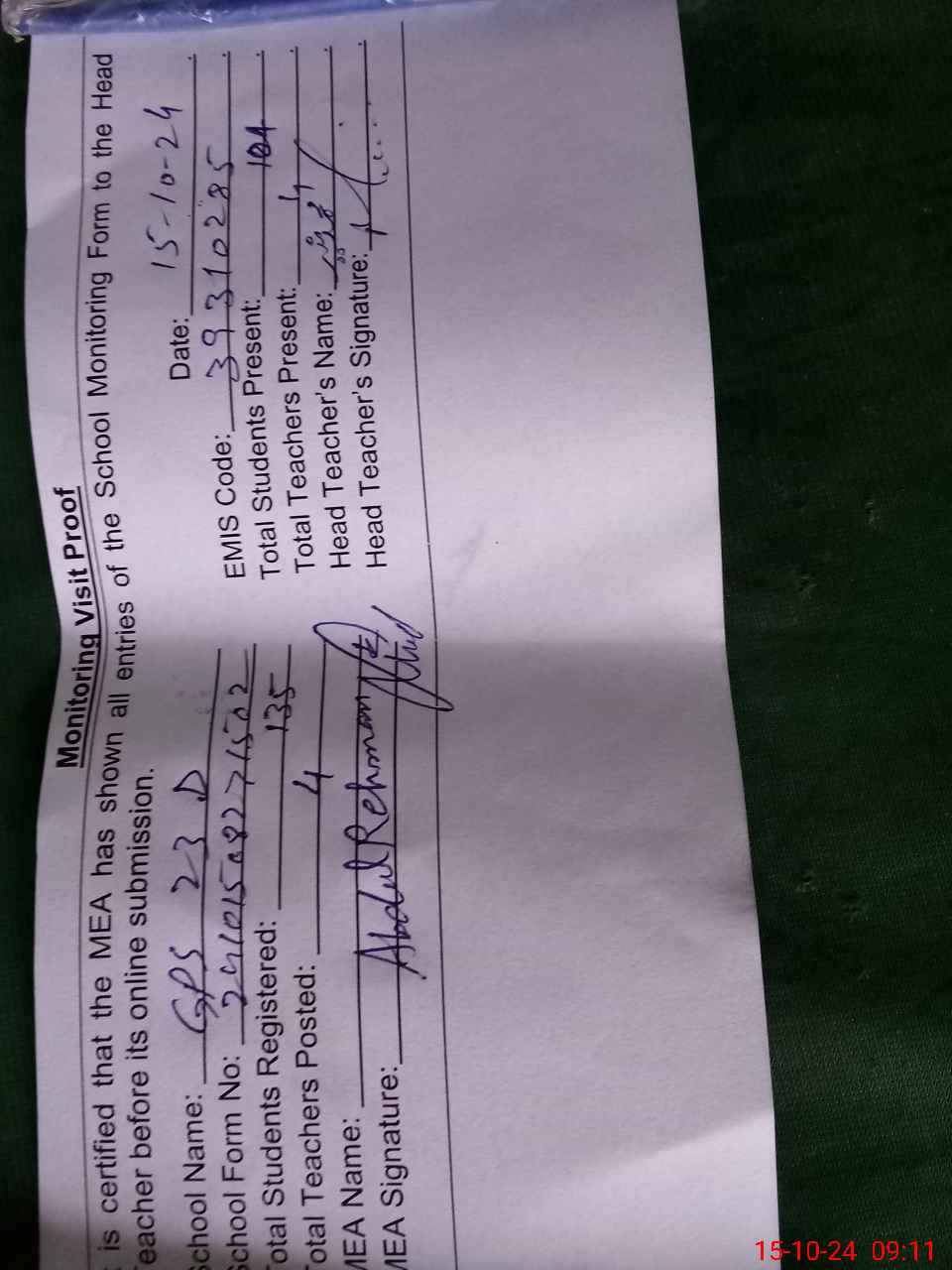 | Attendance Register | Head Teacher | MEA with School | Visit Proof |