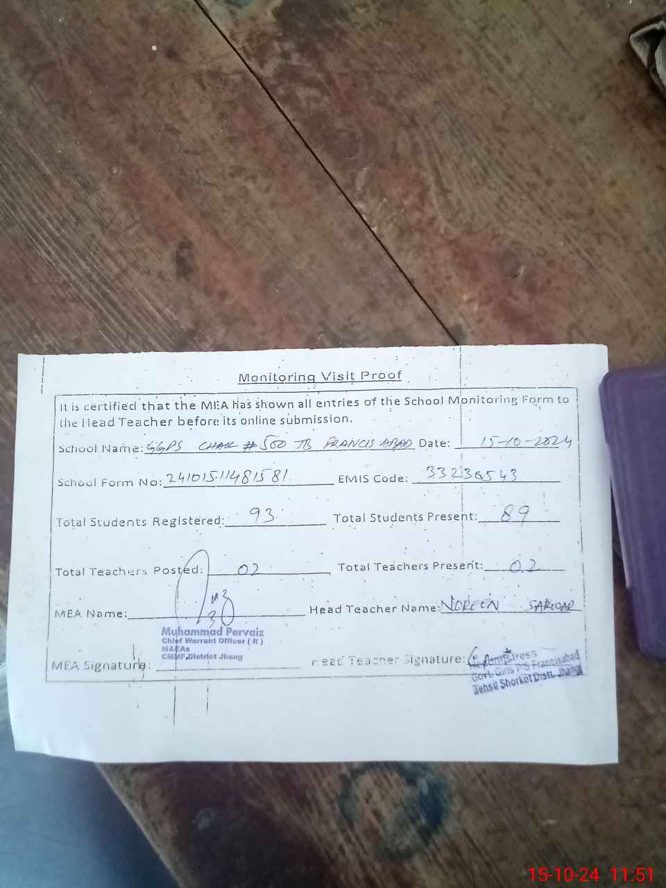 | Attendance Register | Head Teacher | MEA with School | Visit Proof |