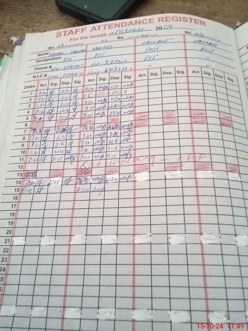 | CNIC | Full Name | Designation | R/C | Absence during last cal. month |