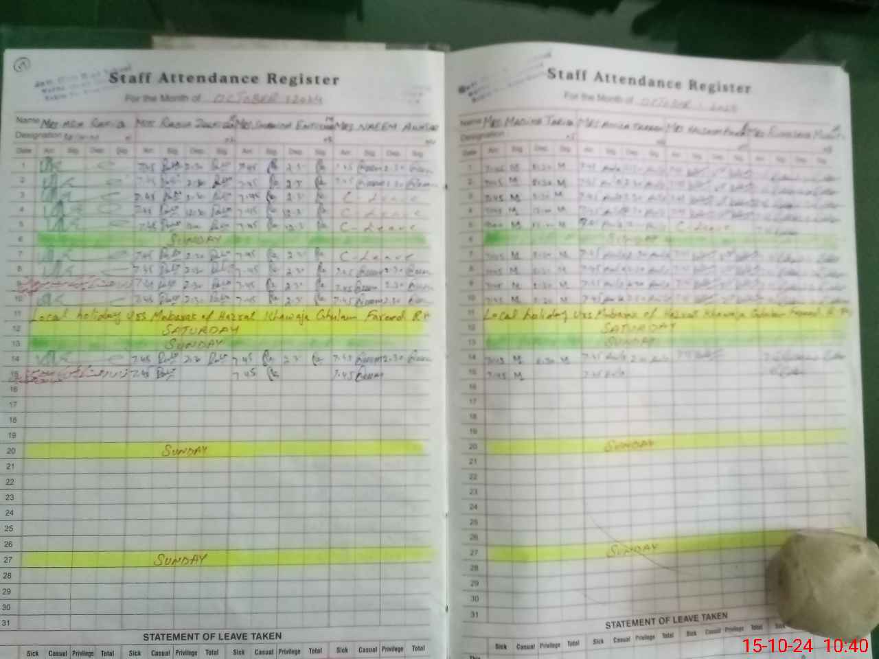 | Monitoring Date: 15-10-2024 | Start Time: 15-10-2024 09:45 AM | End Time: 15-10-2024 10:40 AM | Name of MEA: Ma**** UlHa**** | |