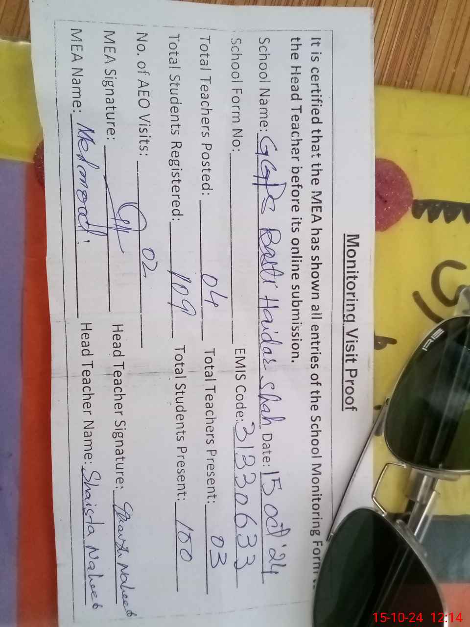 | Attendance Register | Head Teacher | MEA with School | Visit Proof |