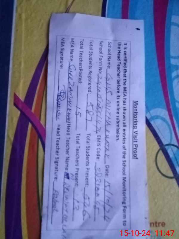 | Attendance Register | Head Teacher | MEA with School | Visit Proof |