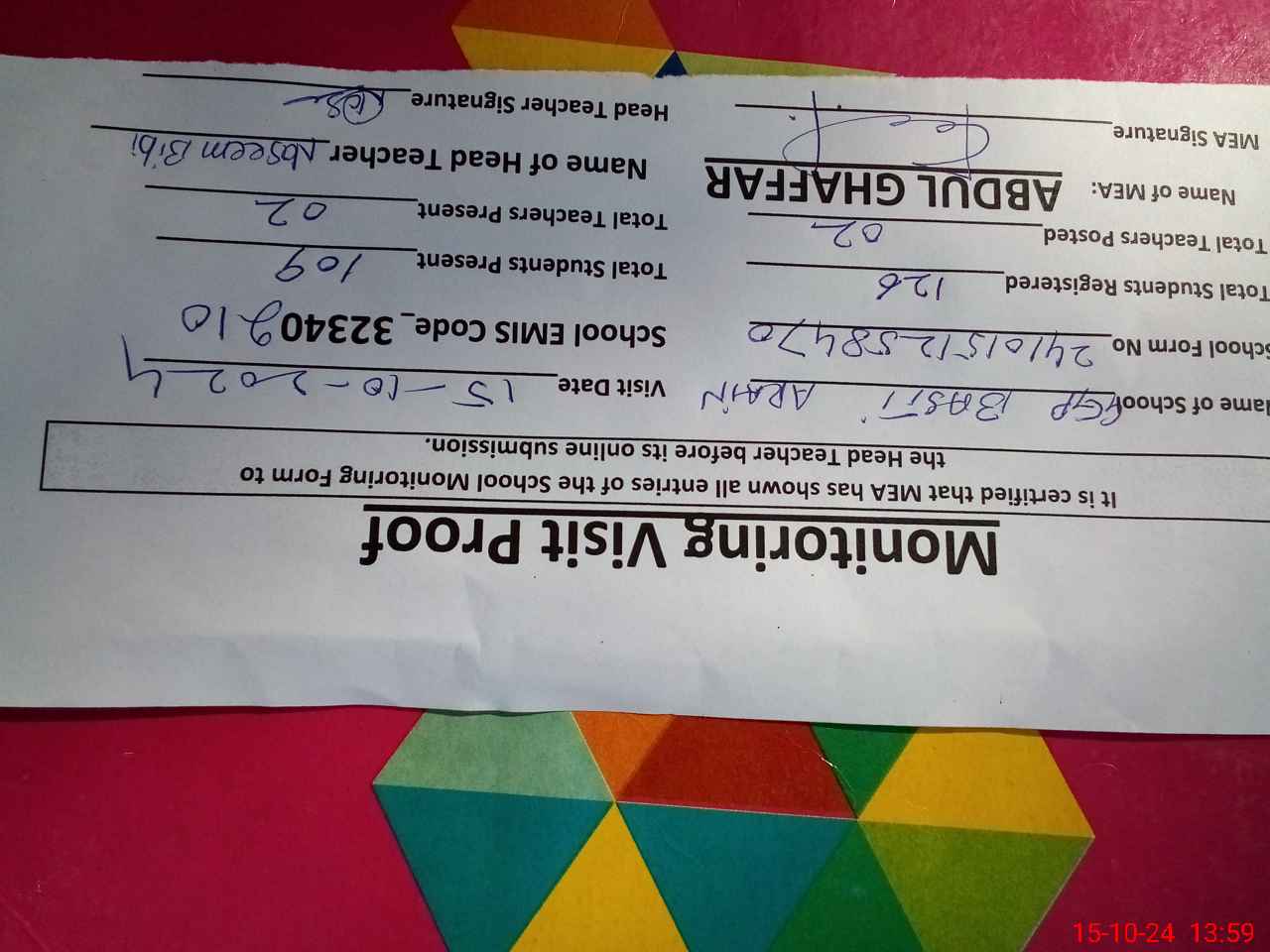| Certified that this School was Inspected by the Undersigned MEA/DMO Today and the Information Stated Above is as Per Record. | |||||