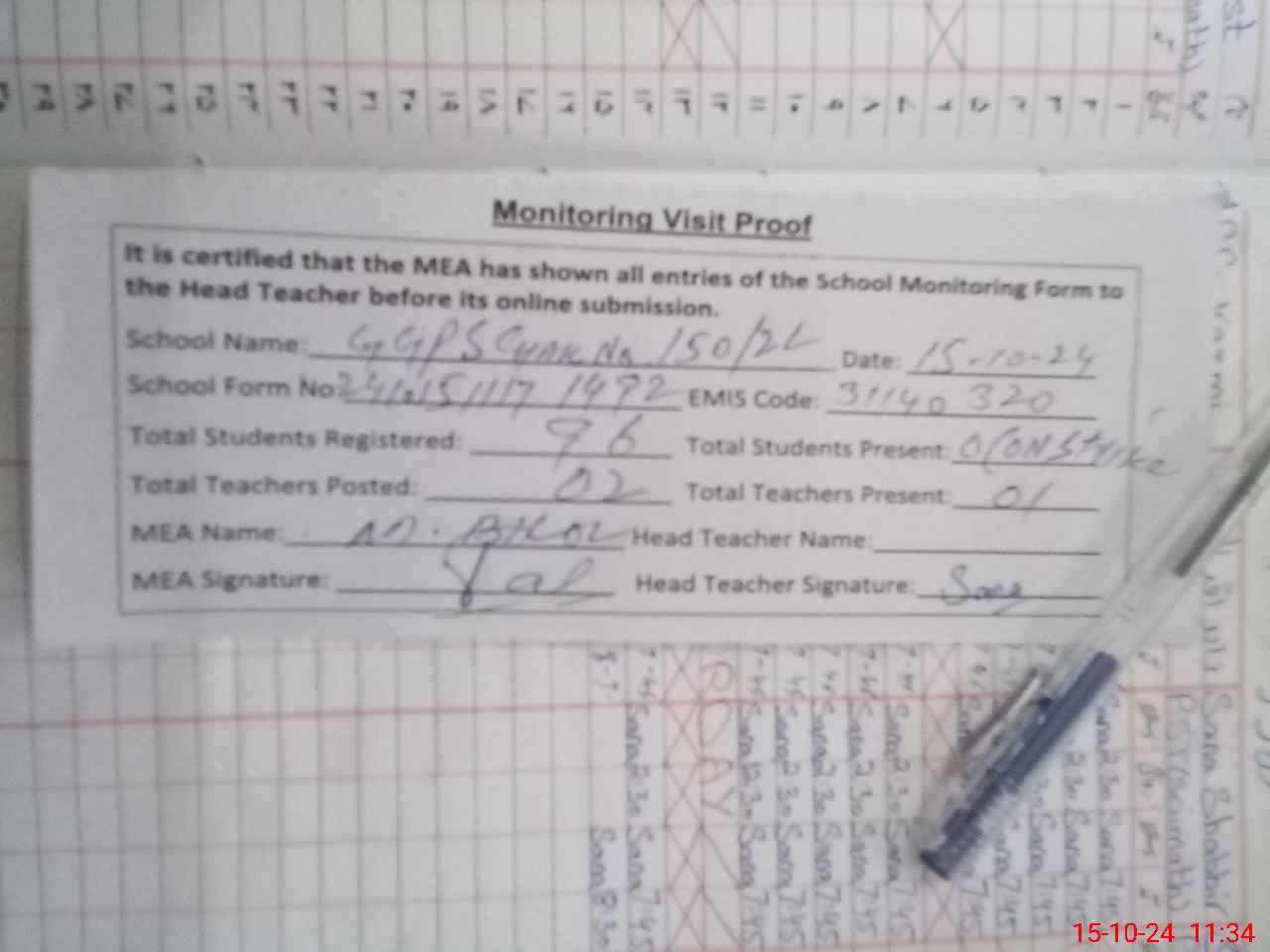 | Attendance Register | Head Teacher | MEA with School | Visit Proof |