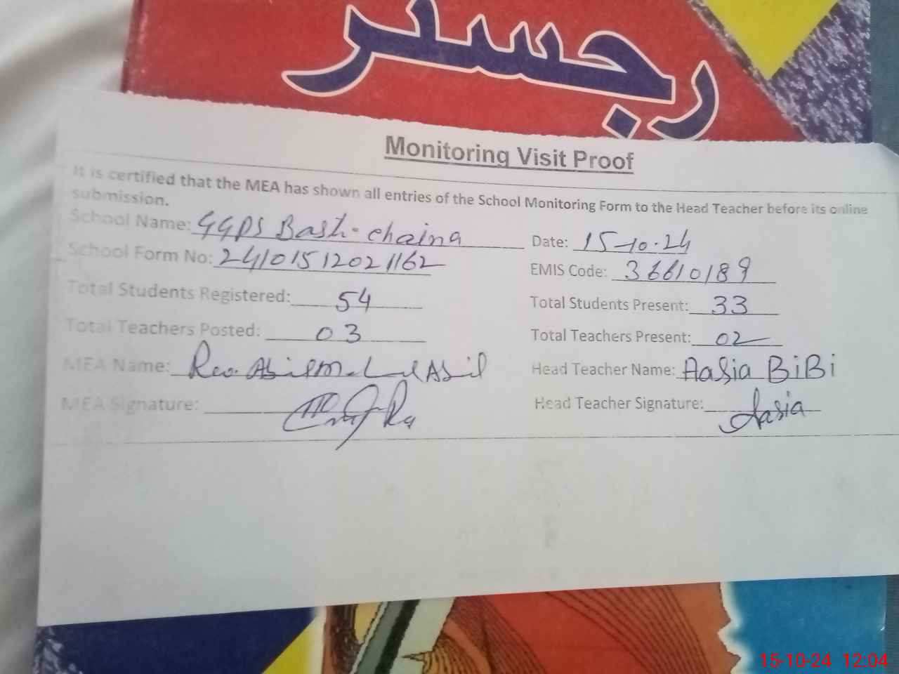 | Attendance Register | Head Teacher | MEA with School | Visit Proof |