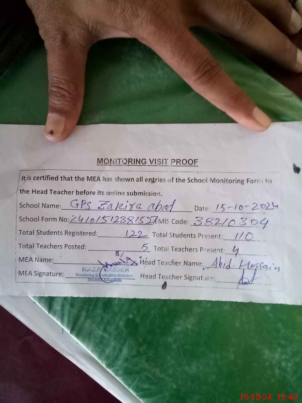 | Attendance Register | Head Teacher | MEA with School | Visit Proof |