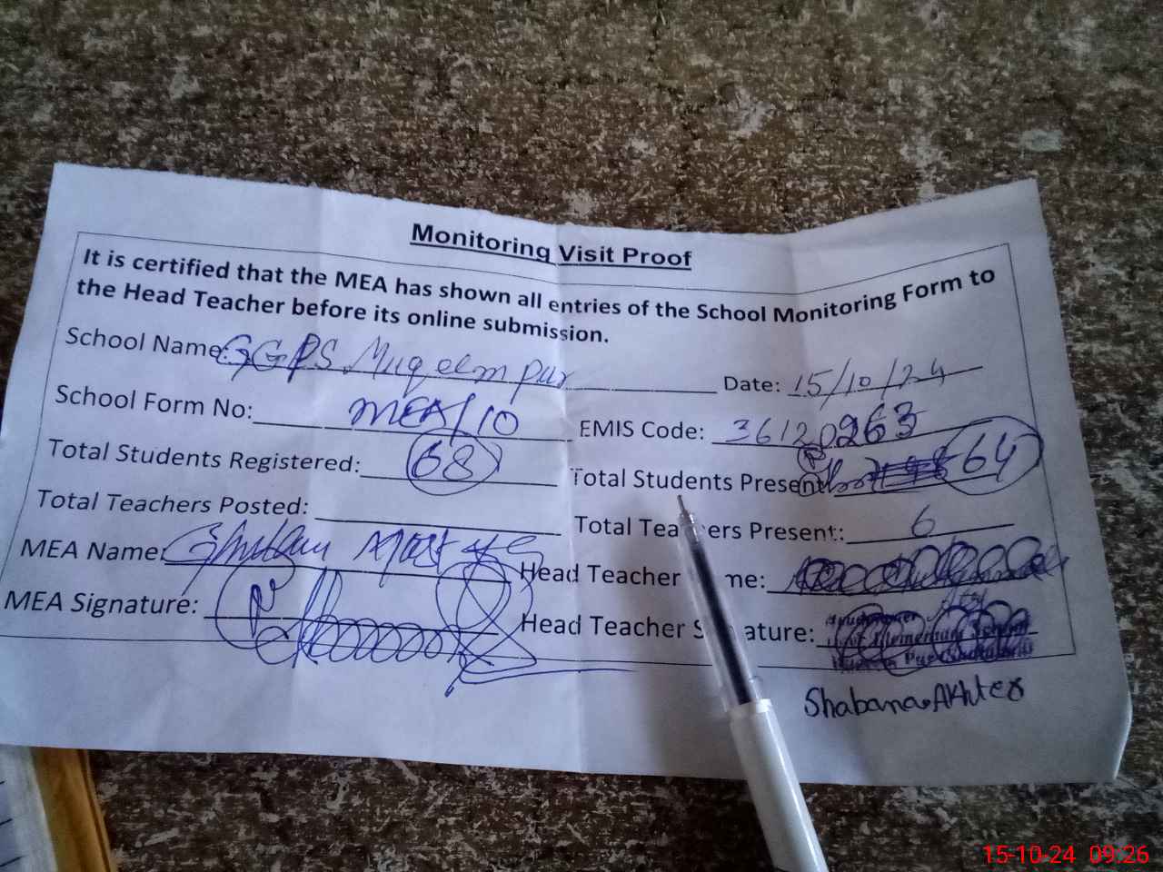 | Attendance Register | Head Teacher | MEA with School | Visit Proof |