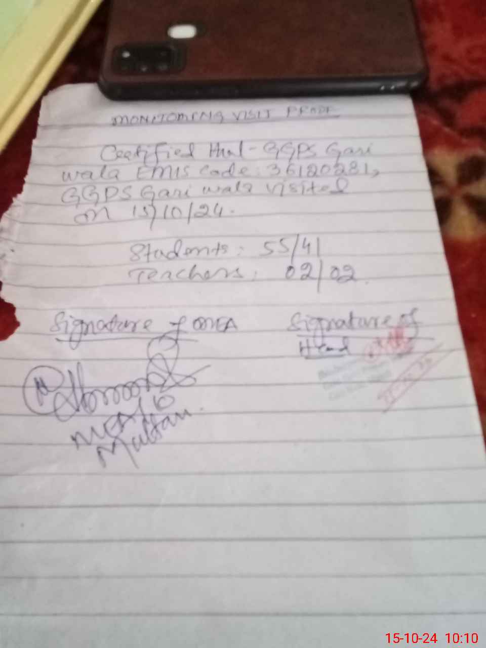 | Monitoring Date: 15-10-2024 | Start Time: 15-10-2024 09:55 AM | End Time: 15-10-2024 10:10 AM | Name of MEA: GH**** MU**** | |