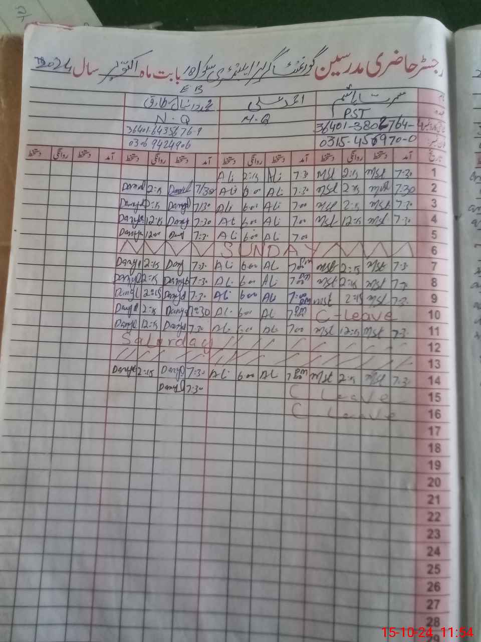 | CNIC | Full Name | Designation | R/C | Absence During Last Calender Month |