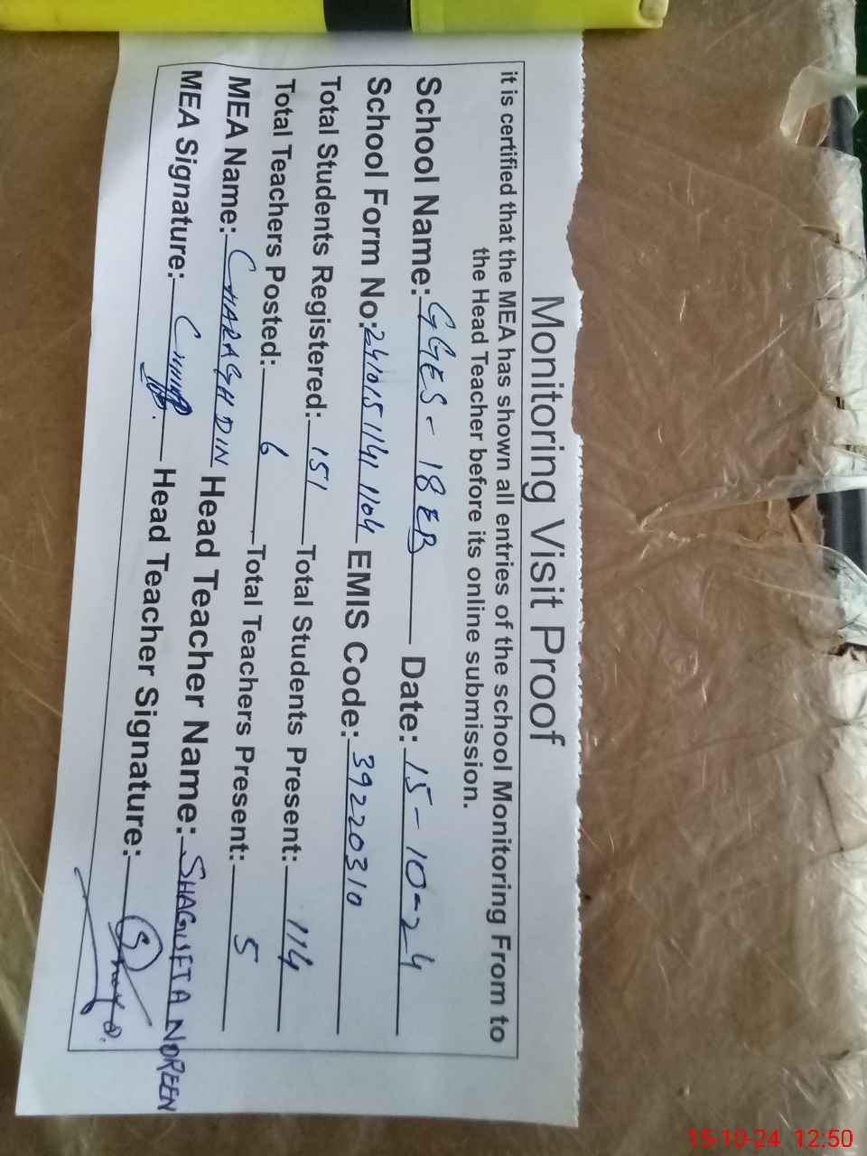 | Attendance Register | Head Teacher | MEA with School | Visit Proof |