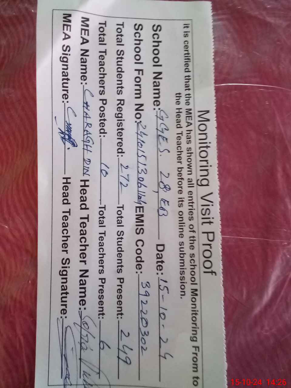 | Certified that this School was Inspected by the Undersigned MEA/DMO Today and the Information Stated Above is as Per Record. | |||||