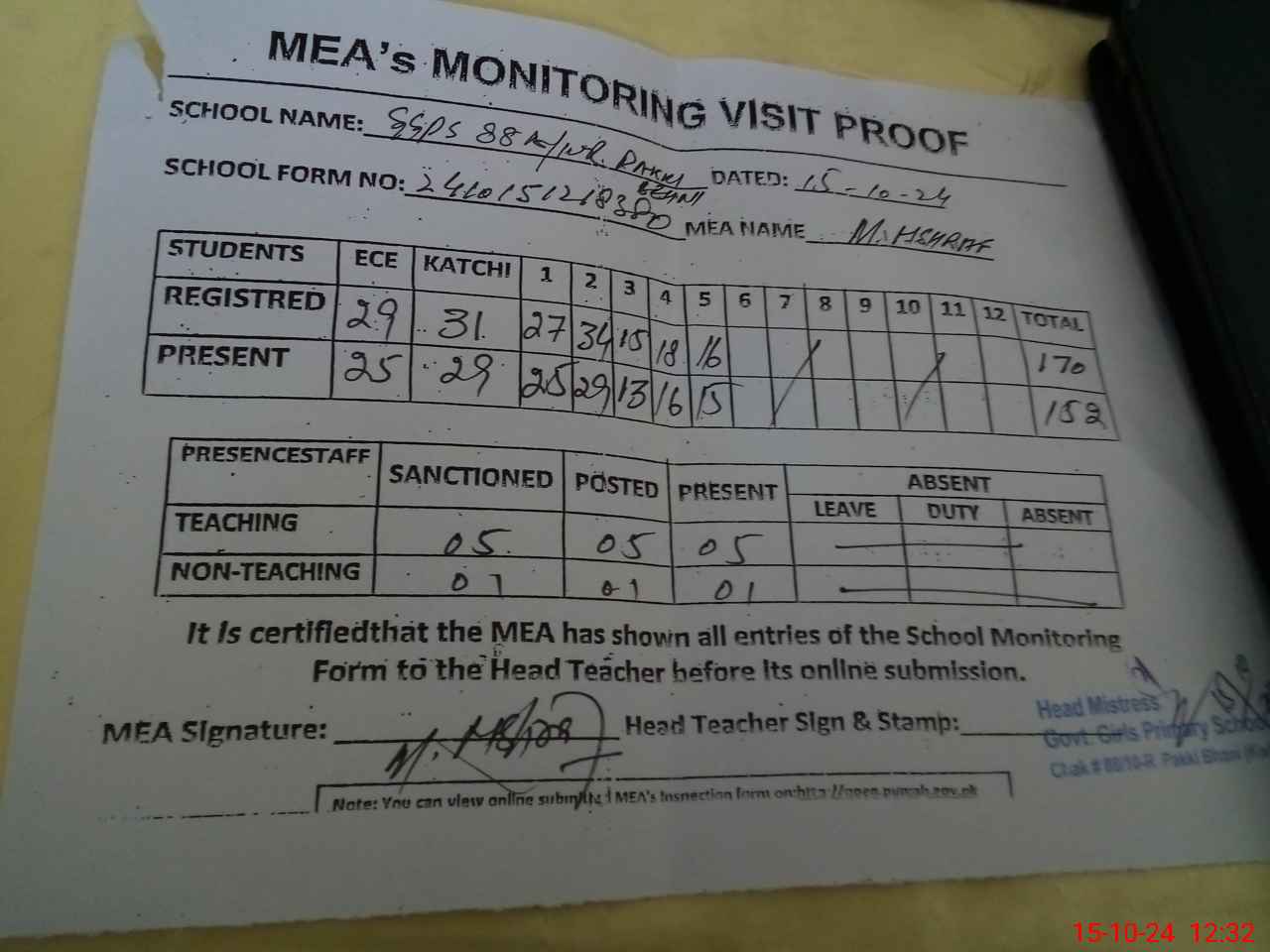 | Attendance Register | Head Teacher | MEA with School | Visit Proof |