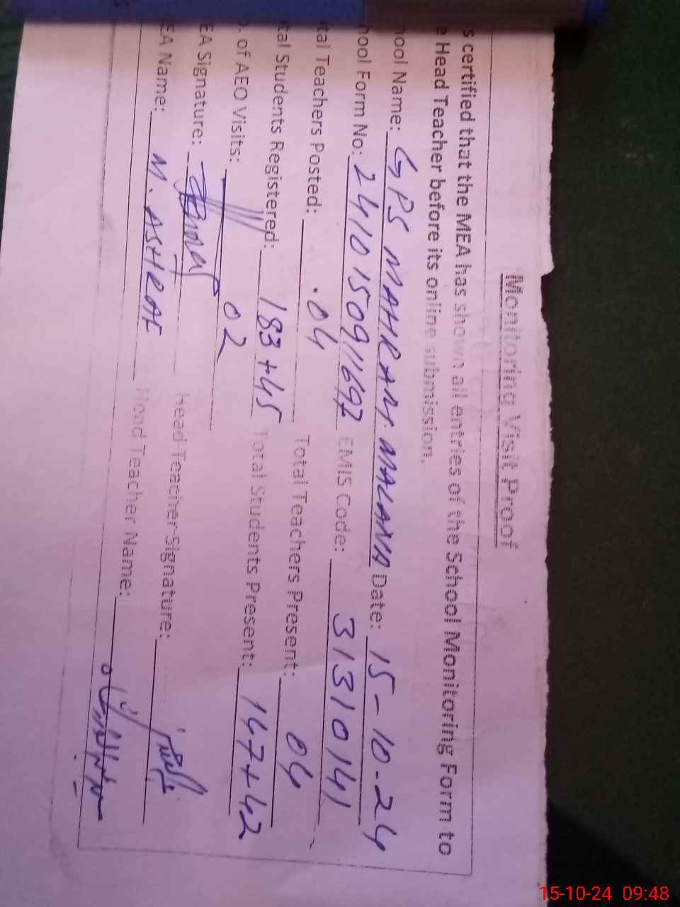 | Attendance Register | Head Teacher | MEA with School | Visit Proof |