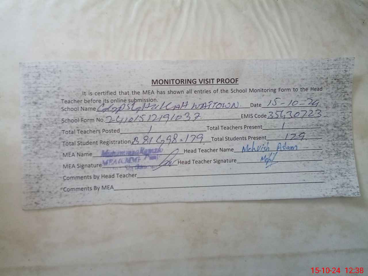 | Attendance Register | Head Teacher | MEA with School | Visit Proof |