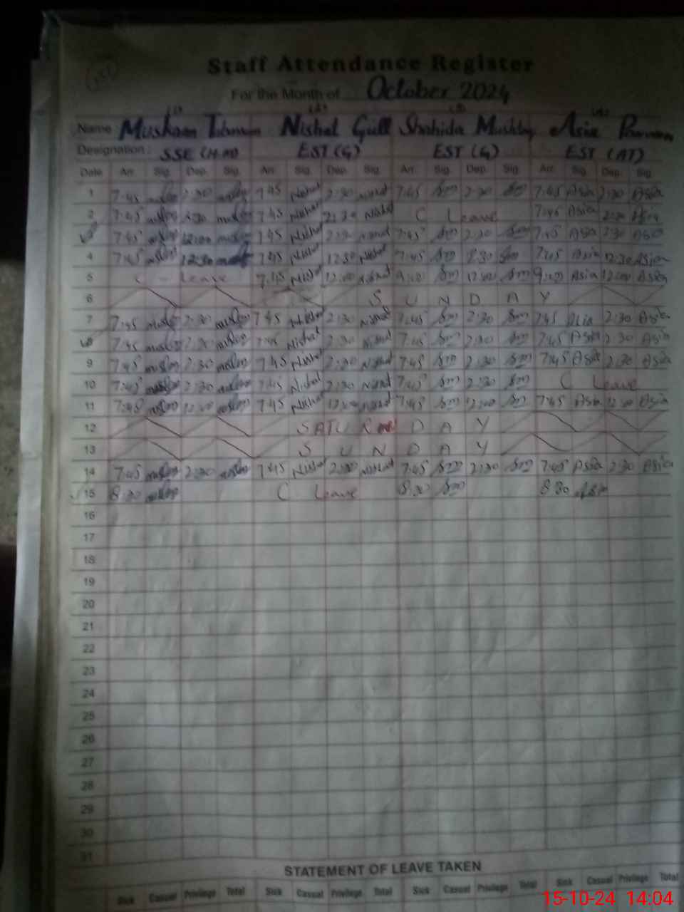 | CNIC | Full Name | Designation | R/C | Absence During Last Calender Month |