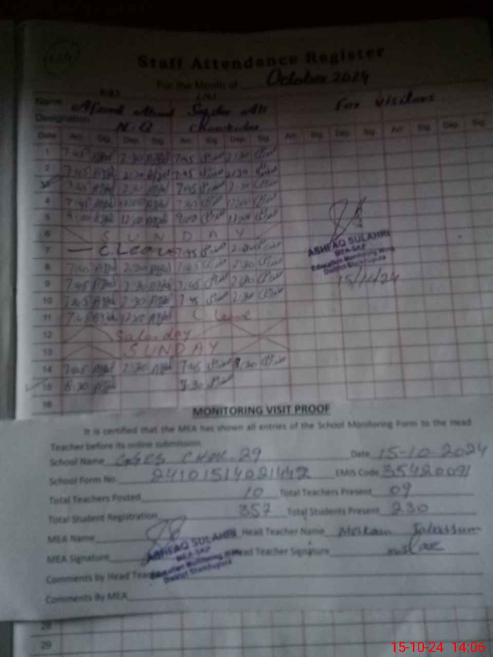 | Attendance Register | Head Teacher | MEA with School | Visit Proof |