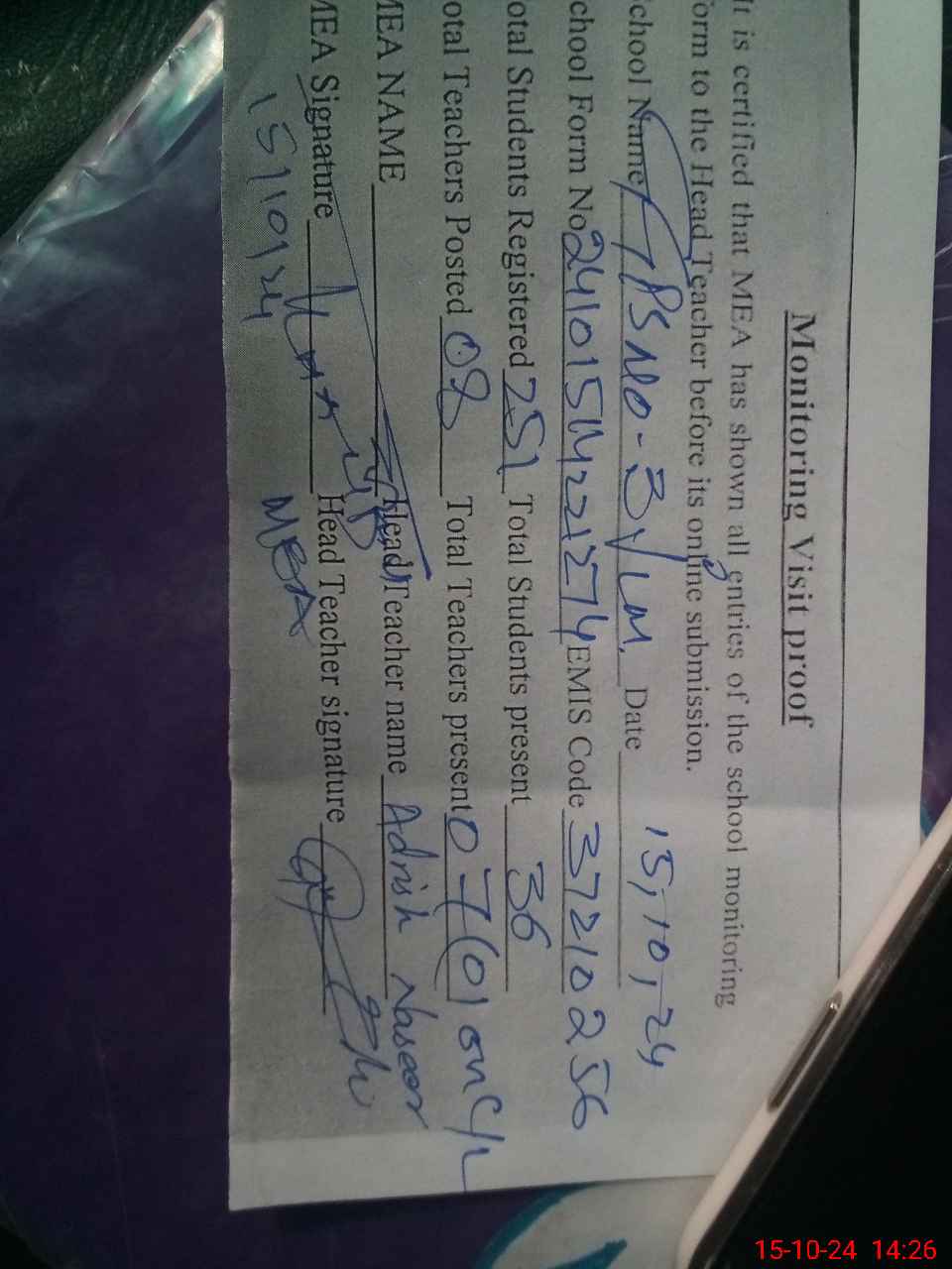 | EMIS Code: 37210256 | Name of School: GGPS NO. 3 JEHLUM | |||