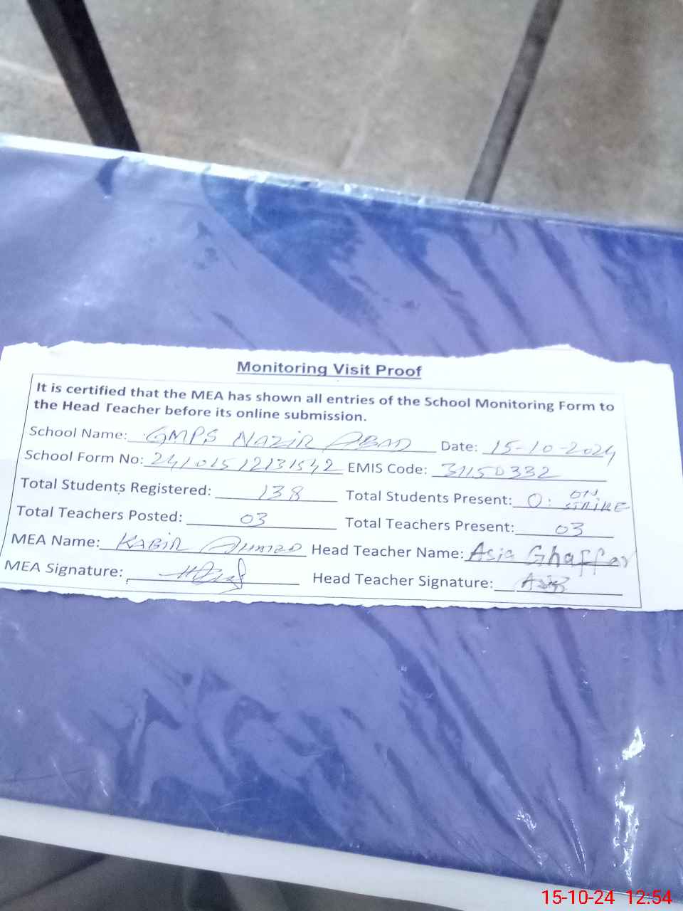 | EMIS Code: 31150332 | Name of School: GMPS NAZIR ABAD | |||