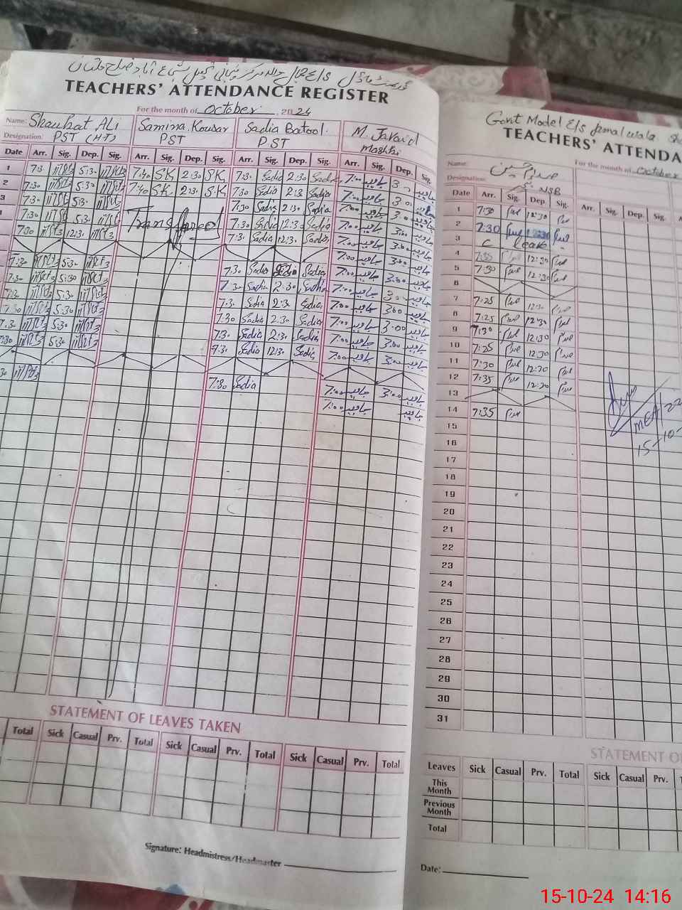 | Remarks (Use Separate Page if Required): Head teacher Shaukat and PST Sadia batool attendence marked on register but physically found absent 2nd shift teaching staff Aisha and Rashida found absent Civ Javed found physically absent Record of NSB and FTF not provided | |||||