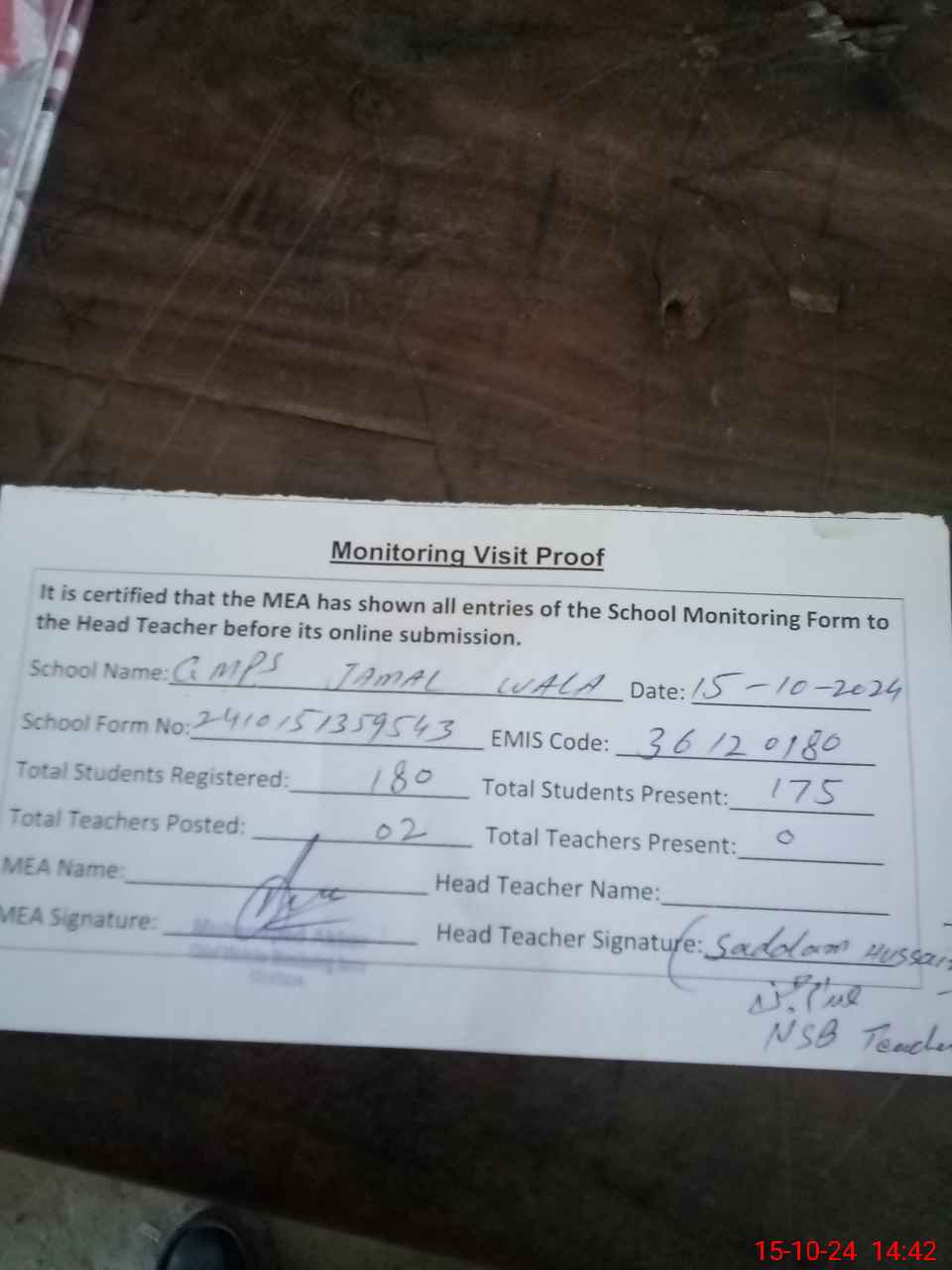 | EMIS Code: 36120180 | Name of School: GMPS JAMAL WALA SHUJABAD | |||