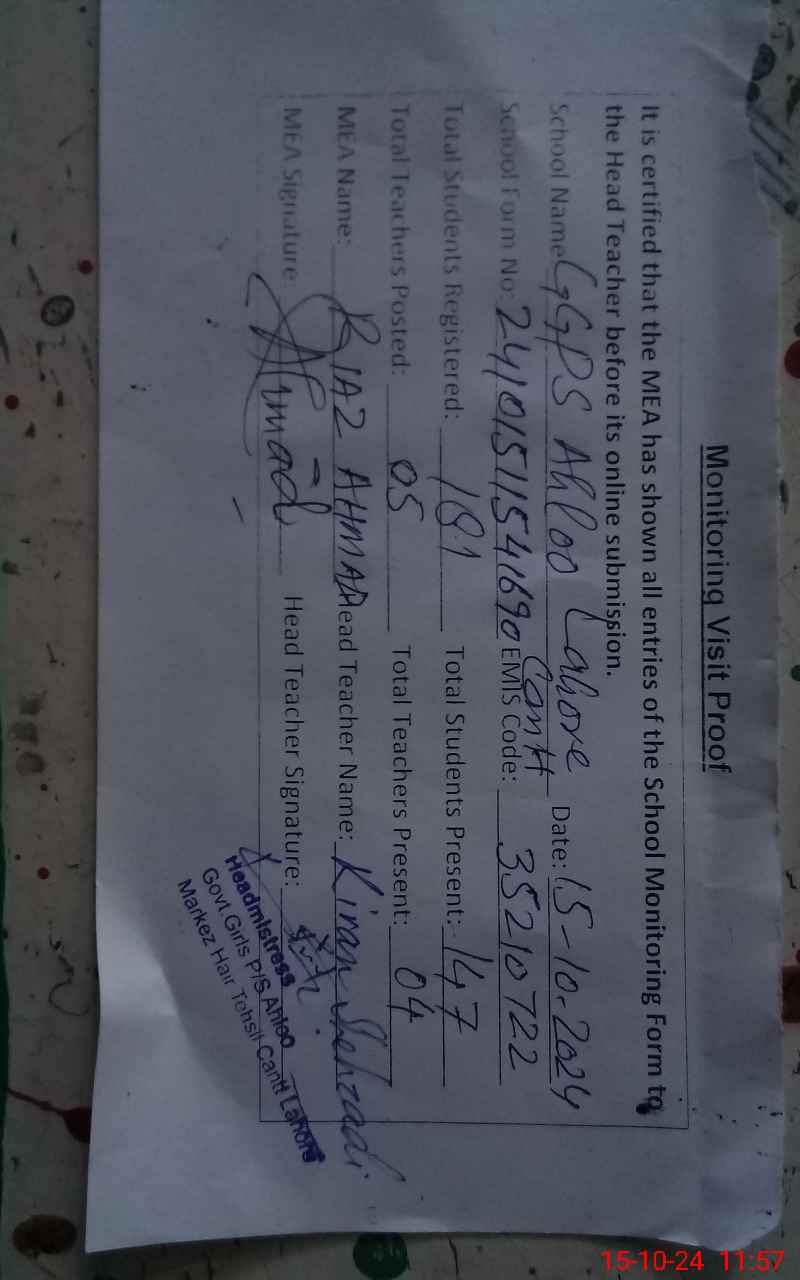 | Certified that this School was Inspected by the Undersigned MEA/DMO Today and the Information Stated Above is as Per Record. | |||||