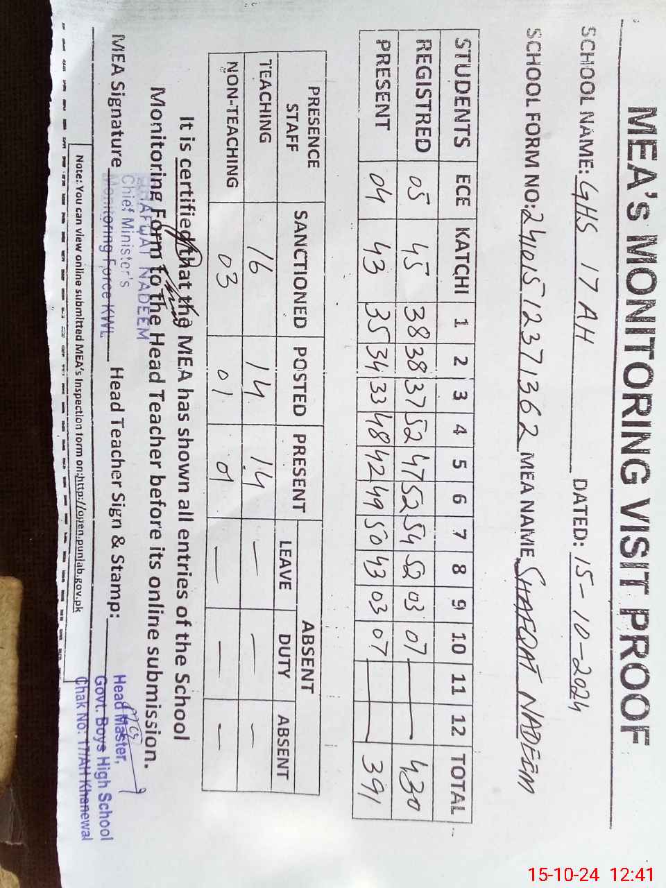 | EMIS Code: 36420067 | Name of School: GHS 17/AH, KHANEWAL | |||
