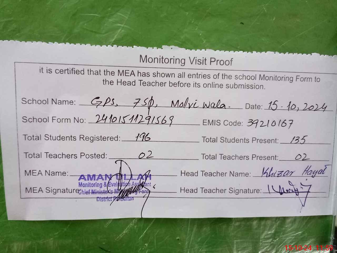 | EMIS Code: 39210167 | Name of School: GPS 7 SP PO MOLVI WALA PAKPATTAN | |||