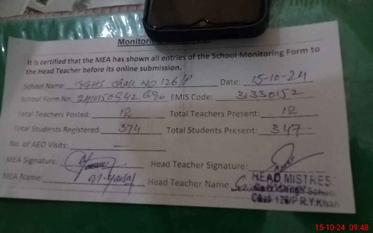| EMIS Code: 31330152 | Name of School: GGHS CHAK NO. 126/P | |||