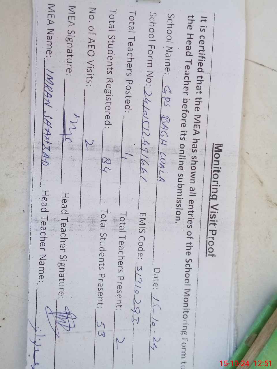 | Attendance Register | Head Teacher | MEA with School | Visit Proof |
